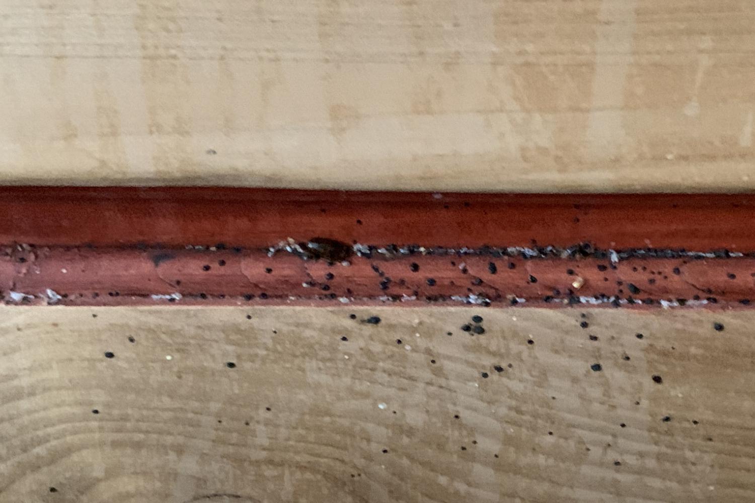 - dunkelbraune bis schwarze Punkte (Bettwanzenkot) an Matratzenrändern, Bettgestell oder Fußleisten,